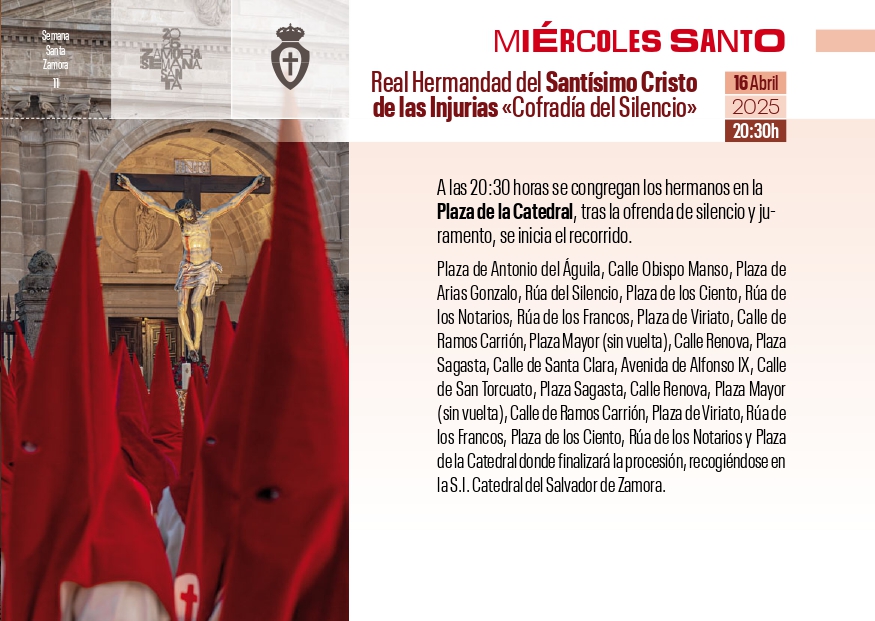 Recorrido: Plaza de Antonio del Águila, Calle Obispo Manso, Plaza de Arias Gonzalo, Rúa del Silencio, Plaza de los Ciento, Rúa de los Notarios, Rúa de los Francos, Plaza de Viriato, Calle de Ramos Carrión, Plaza Mayor (sin vuelta), Calle Renova, Plaza Sagasta, Calle de Santa Clara, Avenida de Alfonso IX, Calle de San Torcuato, Plaza Sagasta, Calle Renova, Plaza Mayor (sin vuelta), Calle de Ramos Carrión, Plaza de Viriato, Rúa de los Francos, Plaza de los Ciento, Rúa de los Notarios y Plaza de la Catedral donde finalizará la procesión, recogiéndose en la S.I. Catedral del Salvador de Zamora.
