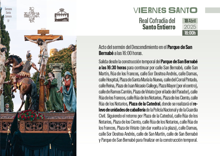 Recorrido: Para continuar por calle San Bernabé, calle San Martín, Rúa de los Francos, calle Sor Dositea Andrés, calle Damas, calle Hospital, plaza de Santa María la Nueva, calle del Corral Pintado, calle Reina, plaza de Juan Nicasio Gallego, Plaza Mayor (por el centro), calle de Ramos Carrión, plaza de Viriato (por el lado del Parador), calle Rúa de los Francos, calle Rúa de los Notarios, plaza de los Ciento, calle Rúa de los Notarios y plaza de la Catedral, donde se realizará el relevo de unidades de caballería de la Policía Nacional y de la Guardia Civil; siguiendo el retorno por plaza de la Catedral, calle Rúa de los Notarios, plaza de los Ciento, calle Rúa de los Notarios, calle Rúa de los Francos, plaza de Viriato (sin dar vuelta a la plaza), calle Damas, calle Sor Dositea Andrés, calle de San Martín, calle de San Bernabé y Parque de San Bernabé para finalizar en la construcción temporal.